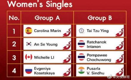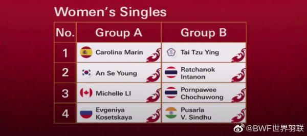女单方面,风头正劲的马林,与安洗莹、李文珊和科塞特卡娅,一同被分入A组。而名将戴资颖、因达农、辛杜和李美妙,组成了B组。