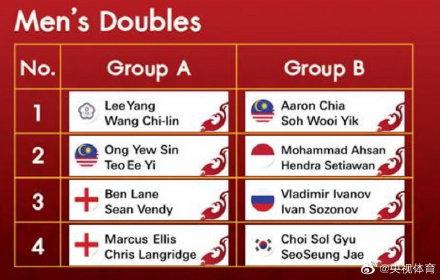 李洋/王齐麟、王耀新/张御宇、埃利斯/兰格里奇、本-莱恩/肖恩-文迪进入男双A组,男双B组中有谢定峰/苏伟译、阿山/塞蒂亚万、伊万诺夫/索佐诺夫、徐承宰/催率圭。