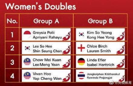 女双方面,波莉/拉哈尤、李绍希/申昇瓒、邹美君/李明艳、叶铮雯/许嘉雯进入A组,金昭映/孔熙容、布里奇/史密斯、埃弗勒/赫特里奇、基蒂塔拉库尔/巴宗哉进入B组。