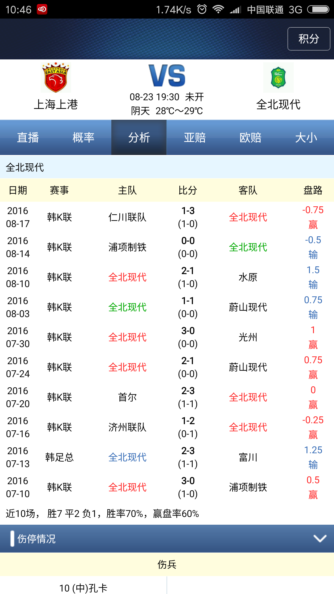 全北现代是一支亚洲强队,球队技战术体系成熟,运动战、定位球得分手段多,球队地面配合默契,体能好,是亚洲的一流强队。全北现代是目前K联赛唯一保持不败的球队,攻守两端均是一流水准,也是目前联赛失球最少的球队。欧赔开出2.73-3.24-2.43的组合,具有代表性的威廉希尔、立博等主流公司稍抬高主胜,并进一步下调平赔,而即时客胜指数离散较大,上盘阻力持续加深;综合来看,本场比赛上海上港有望在主场立于不败之地。