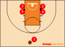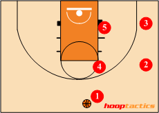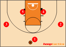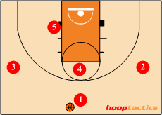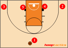 2号和4号位对应站在一边。2号位随时准备接球突进得分,4号位球员则可以帮助策应,也可以自己得分。
