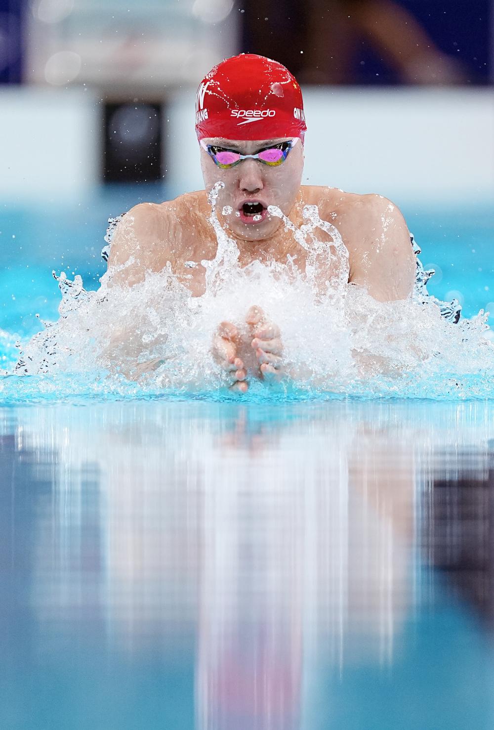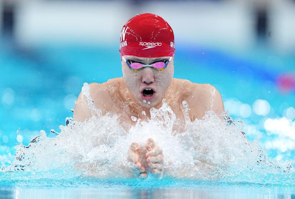 12月14日,在山东济南举行的2023年全国游泳锦标赛男子200米蛙泳决赛中,覃海洋以2分09秒45的成绩夺冠。图为比赛现场。 中新社记者 富田 摄