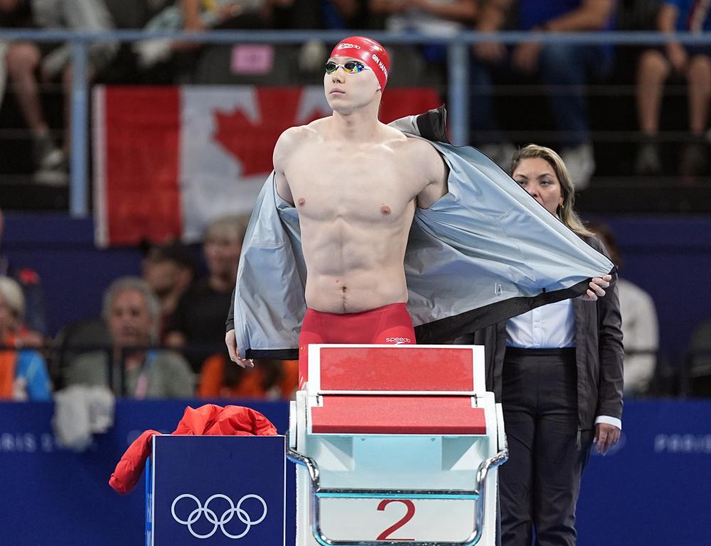 7月27日,中国选手覃海洋在比赛中入水,最终他晋级决赛。新华社记者 杜宇 摄