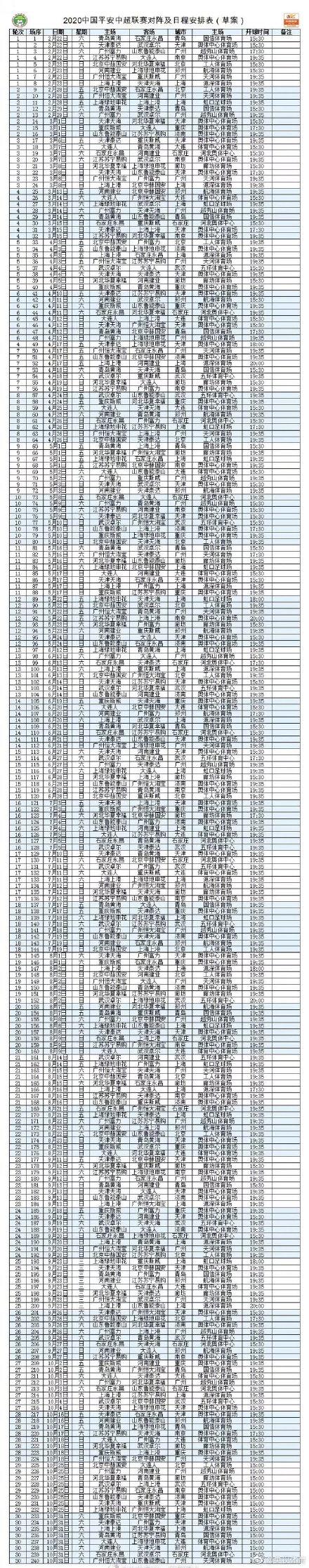 【新赛季中超赛程出炉!】今天,中国足协官方公布了2020赛季中超联赛对阵及日程安排表的草案。根据安排,新赛季中超联赛将在2月22日揭幕,10月31日收官。联赛共30轮,分为上下半程,镜像对阵。每轮比赛至少安排1场且不多于2场精彩比赛。任何球队最后两轮比赛均为一个主场,一个客场。尽可能为参加亚冠的球队编排最合理的赛程和比赛时间。详情见图: