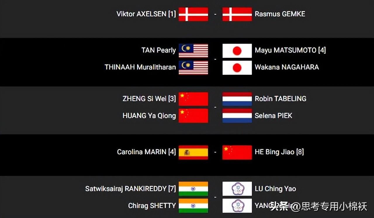接下来,法国羽毛球公开赛进入最后一个比赛日,争冠战从北京时间10月30日晚上20点开始,5项决赛依次是:男单安赛龙对阵格姆克、女双陈康乐/蒂娜对阵松本麻佑/永原和可那、混双郑思维/黄雅琼对阵塔博林/皮克、女单马林对阵何冰娇、男双兰基雷迪/谢提对阵卢敬尧/杨博涵,祝国羽好运!