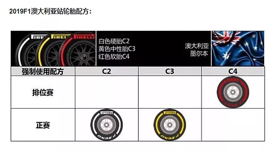 本赛季轮胎规则:2019赛季每站的轮胎只用白,黄,红三种颜色表示,但会从五种配方中选择其中三种用于每一站的比赛,C1是最硬的配方,C5是最软的配方。