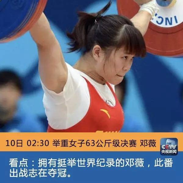 北京时间8月10日凌晨2:30举行的举重女子63公斤级A组比赛,中国名将邓薇将冲击金牌。在今年4月举行的2016全国女子举重锦标赛暨里约奥运会选拔赛中,邓薇两次超过挺举和总成绩的世界纪录。