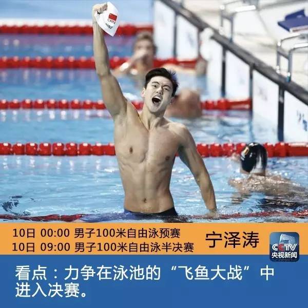 北京时间8月10日00:17,游泳队的颜值担当宁泽涛将携余贺新亮相男子100米自由泳预赛,他们力争进入半决赛和决赛。宁泽涛作为喀山世锦赛的100米自由泳冠军,在该项目上具有冲击奖牌的实力。