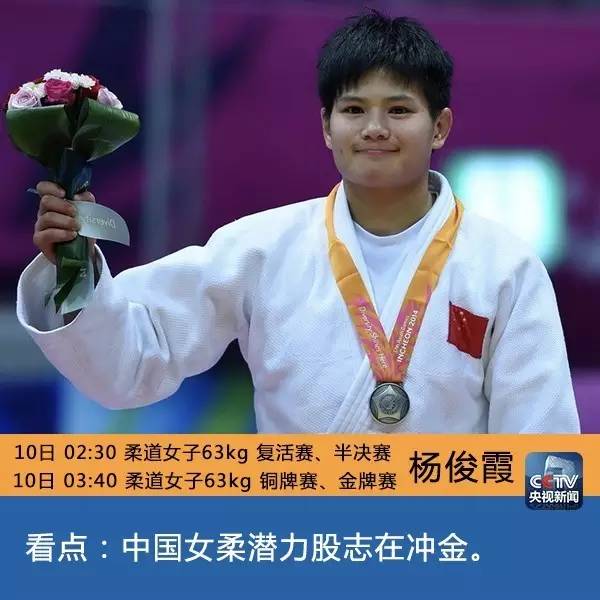 北京时间8月10日3:40将进行女子柔道63公斤级铜牌赛、金牌赛,杨俊霞将出战。杨俊霞在去年世界柔道大奖赛上夺得金牌,此次奥运有望争夺奖牌。