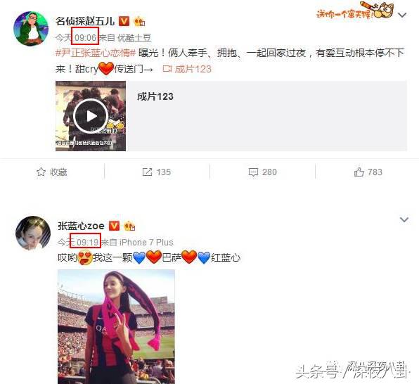 张蓝心这边的反应也很奇怪,赵五儿9:06曝的恋情,她完全没反应,但是9:19发了条庆祝巴萨赢球的微博