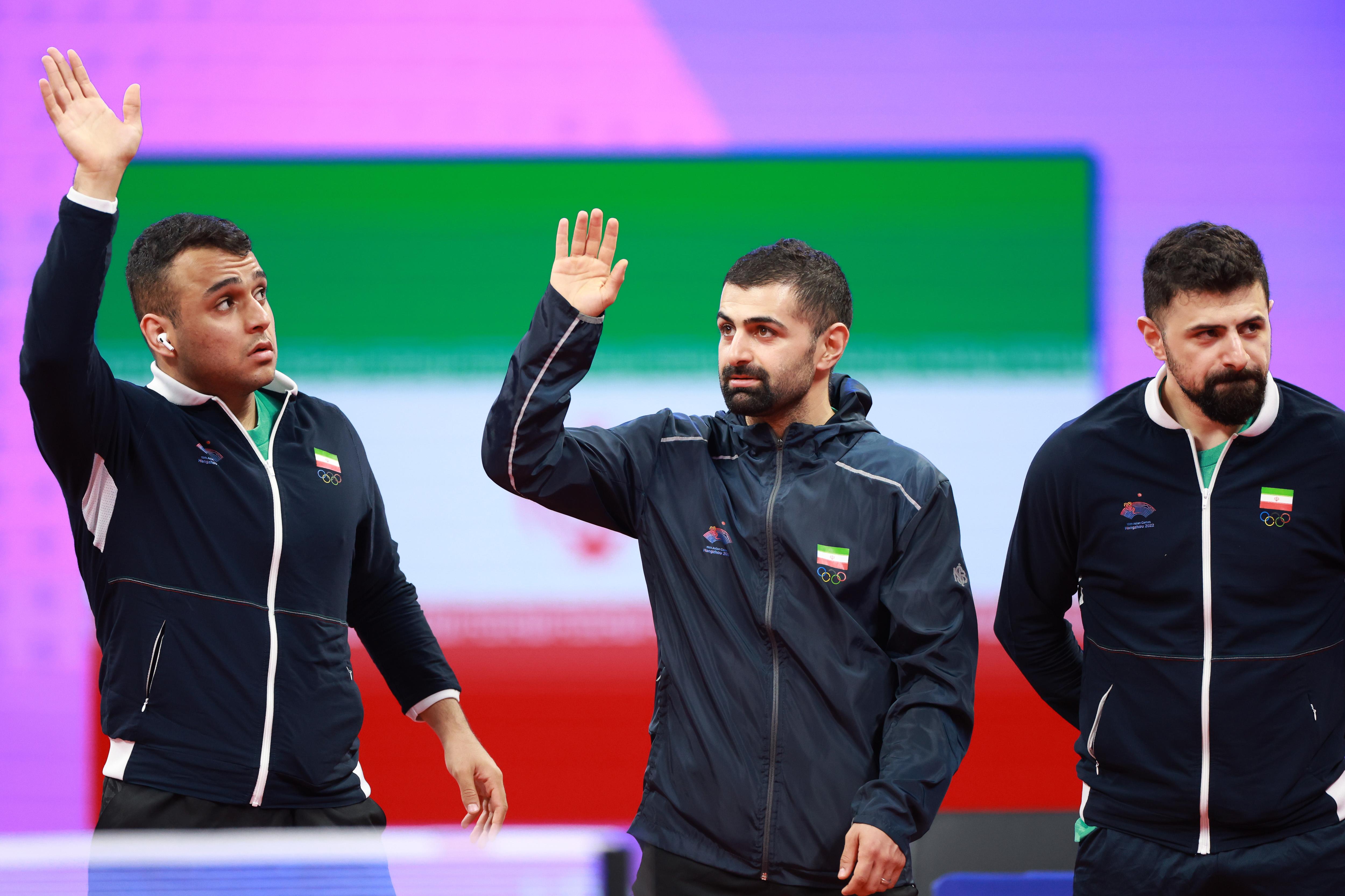 9月25日,伊朗队选手在杭州亚运会乒乓球男子团体半决赛前,中间者为诺沙迪·阿拉米扬。新华社记者 刘续 摄