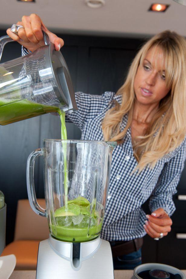 这款冰沙,包括乳清蛋白奶昔、果汁、胡萝卜汁、黑莓、杏仁以及半个鳄梨。
