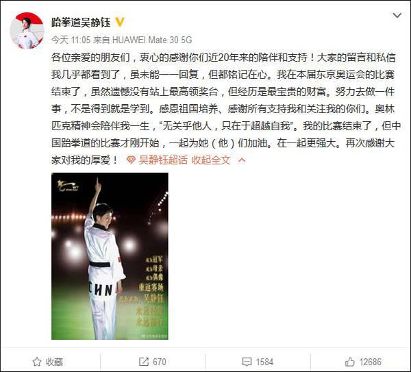 她说,“各位亲爱的朋友们,衷心的感谢你们近20年来的陪伴和支持!大家的留言和私信我几乎都看到了,虽未能一一回复,但都铭记在心。我在本届东京奥运会的比赛结束了,虽然遗憾没有站上最高领奖台,但经历是最宝贵的财富。努力去做一件事,不是得到就是学到。感恩祖国培养、感谢所有支持我和关注我的你们。奥林匹克精神会陪伴我一生,“无关乎他人,只在于超越自我”。我的比赛结束了,但中国跆拳道的比赛才刚开始,一起为她(他)们加油。在一起更强大。再次感谢大家对我的厚爱!”