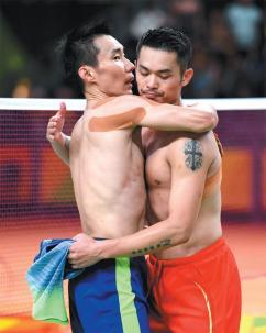 里约热内卢,8月19日,林丹(右)和李宗伟赛后拥抱致意。当日,在2016年里约奥运会羽毛球男子单打半决赛中,中国选手林丹以1比2不敌马来西亚选手李宗伟,无缘决赛。由于这将是两人奥运会赛场上的最后一次对决,林丹和李宗伟在赛后除了击掌、拥抱外,还现场交换了球衣。李宗伟将在决赛对阵中国选手谌龙。 新华社记者 吕小炜 摄
