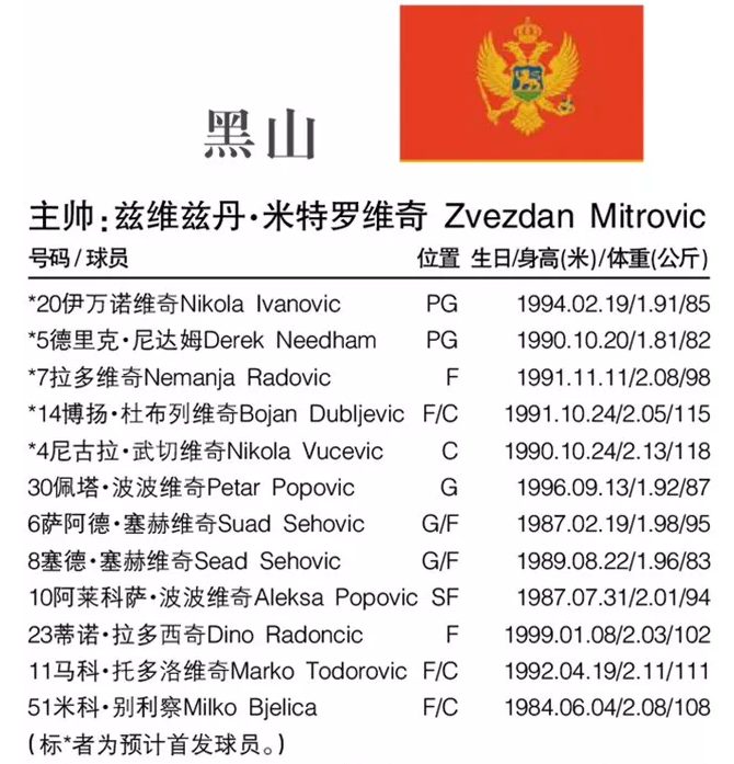 黑山~ 核心:中锋武切维奇、控卫德里克尼达、前锋杜布列维奇、大前锋托多罗维奇