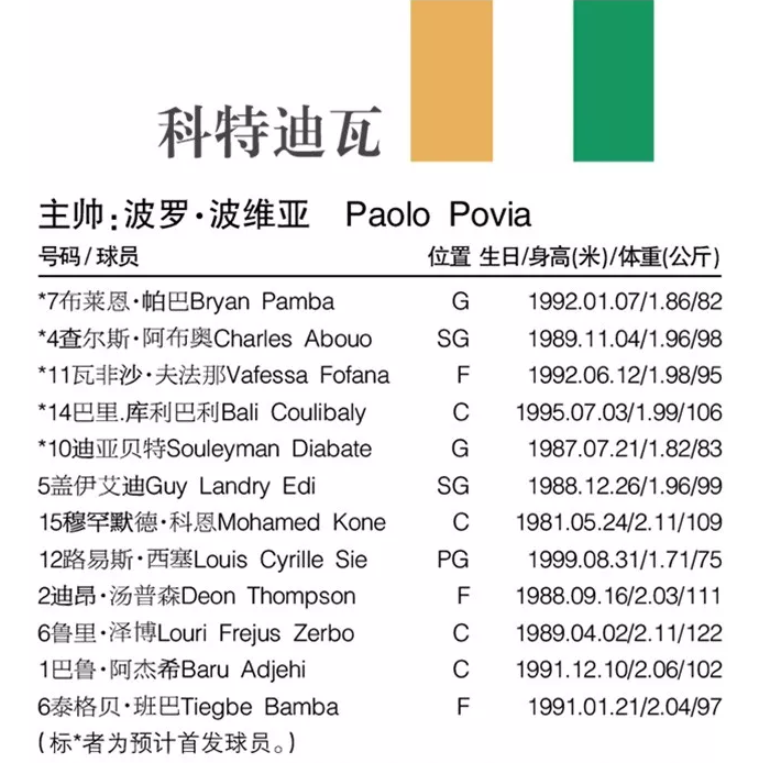 科特迪瓦~ 核心球员:控卫迪亚贝特,分卫阿布奥,锋卫盖伊( 队长)