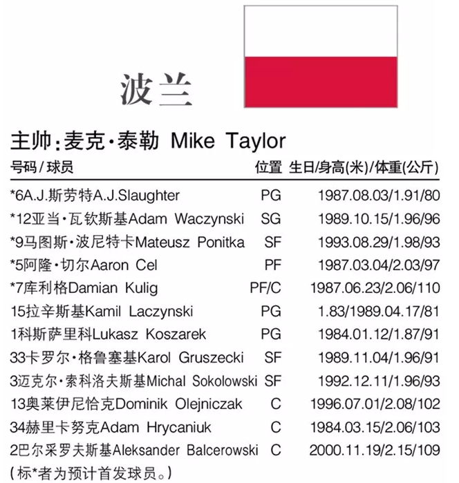 波兰~ 核心球员:后卫AJ-斯劳特,前锋波尼特卡