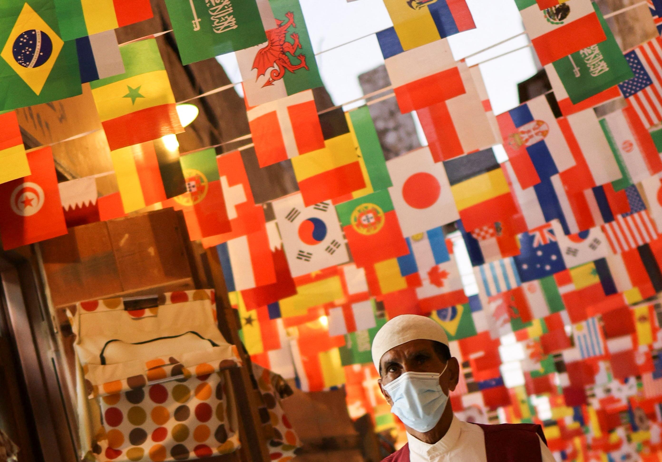 11月13日,卡塔尔多哈,当地传统市场售卖世界杯周边产品。 图/IC photo
