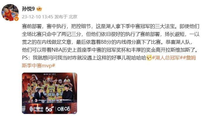 赛后,CBA名宿、前湖人球员、本场比赛的解说孙悦更博道:“赛前部署,赛中执行,把控细节,这是湖人拿下季中赛冠军的三大法宝。即使他们全场比赛只命中了两记三分,但他们依旧很好的执行了赛前部署,扬长避短,一以贯之的在内线做足文章,最后依靠着88分的内线得分赢下了比赛。恭喜湖人队,他们可以带着NBA历史上首座季中赛的冠军奖杯和丰厚的奖金离开拉斯维加斯了。PS:我就想问问我当时咋就没遇上这样的好事儿呢哈哈哈。”
