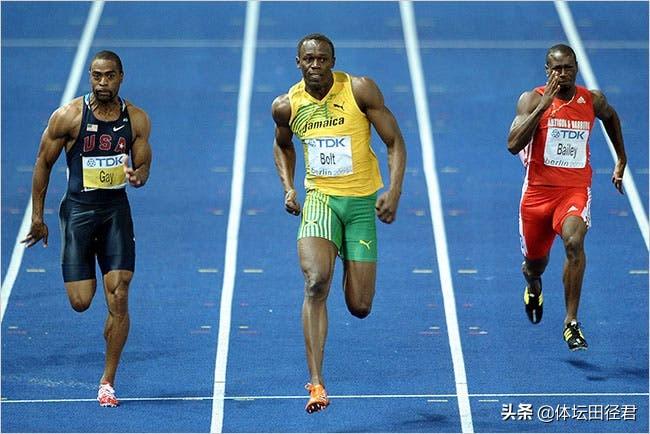 世界纪录是博尔特柏林世锦赛跑出的9秒58,获1356分,博尔特三次打破世界纪录,提升幅度达到惊人的0.16秒,持平了卡尔文史密斯、卡尔刘易斯、伯勒尔、多诺万贝利、莫里斯格林五大飞人提升幅度的总和,博尔特实现百米三圈大满贯成就,硬实力超强绝伦无人能敌,这在他放水减速破世界纪录+夺大赛金牌的表现看得出来,即便是2015-2016生涯末期,实力明显下滑,博尔特也能凭借大心脏击败各路飞人,复制奥运会世锦赛三金辉煌。