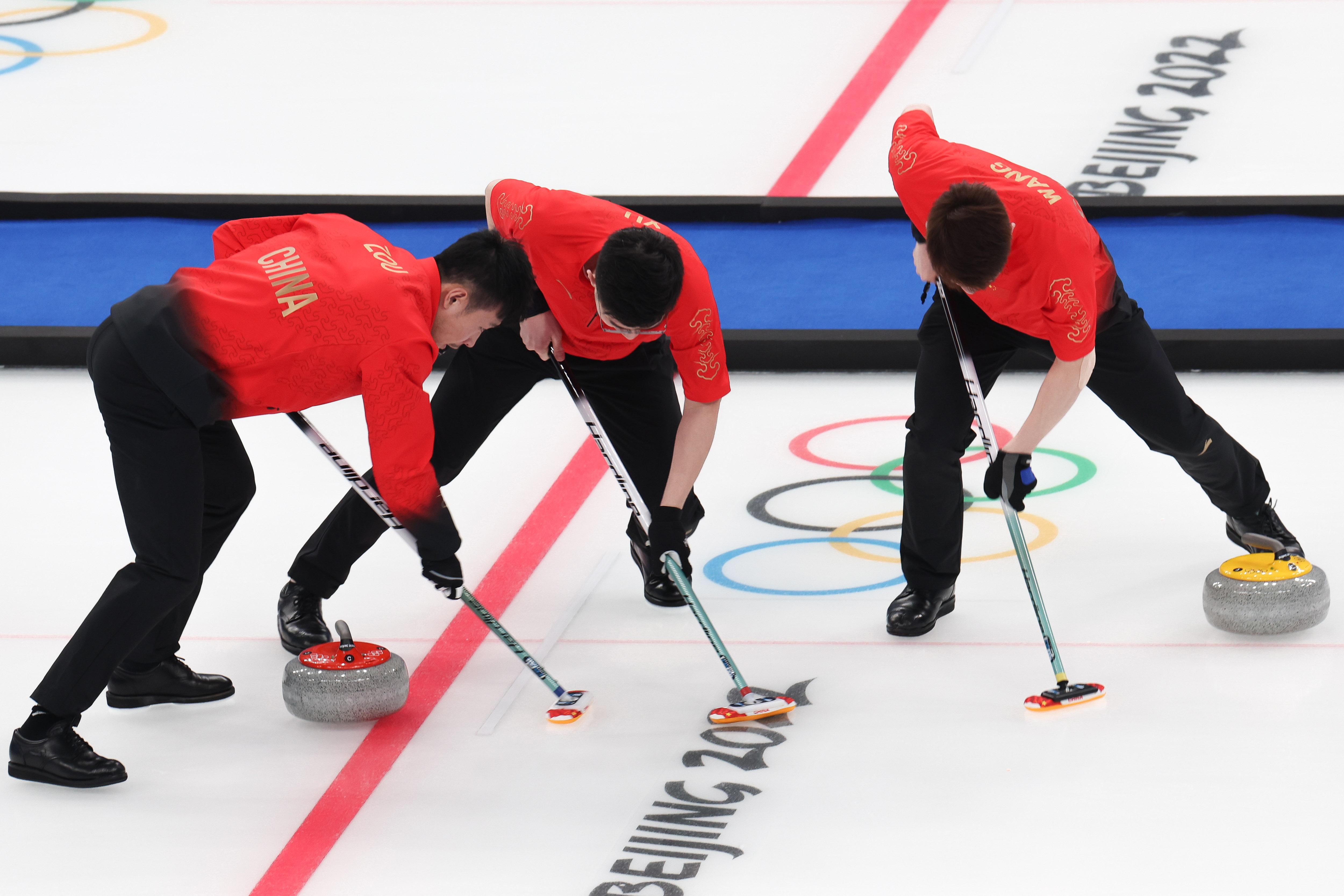 2月10日,中国队选手邹强、许静韬、王智宇(从左至右)在北京2022年冬奥会男子冰壶循环赛比赛中。新华社记者刘续摄