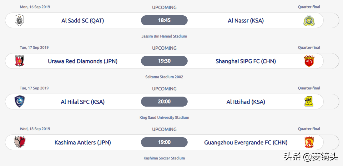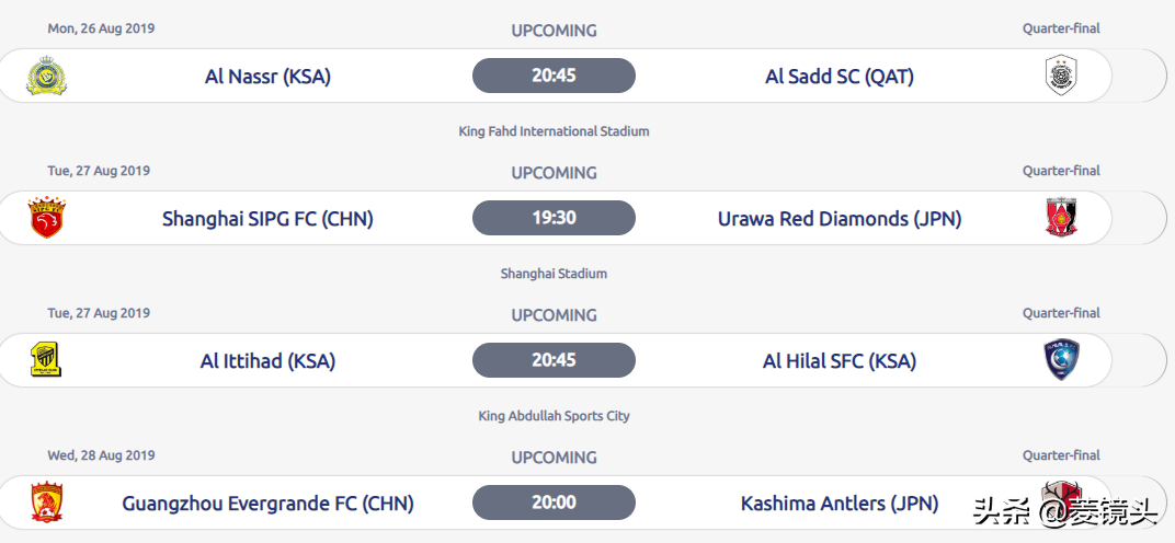 北京时间8月18日,亚足联在官网公布了2019赛季亚冠1/4决赛的两回合开球时间。其中东亚区首回合,恒大和上港都是主场作战,上港与浦和的比赛8月27日19:30开球,恒大主场和鹿岛的比赛8月28日20:00开球。