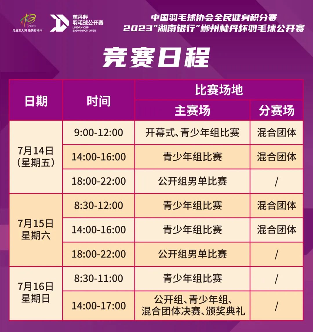 主赛场地址(公开组男单、青少年组):郴州市体育中心林丹羽毛球俱乐部