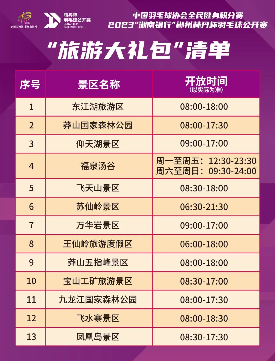 赛事组委会为参赛选手精心准备了各种福利好礼,所有参赛选手可凭参赛证、身份证免首道门票畅游郴州市13个景区,还有“郴”心“郴”意大礼包, 让参赛选手在郴州比赛的同时,可以领略“山水郴州”之美,品尝郴州美食。“羽林”相约 郴州相见