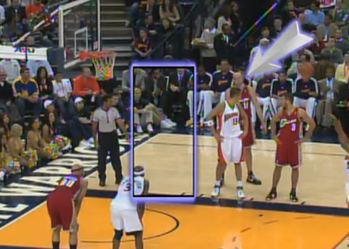 防守犯规发生在进攻球员进入投篮动作中。在进攻球员收球之后,防守球员抓住对方的右臂。