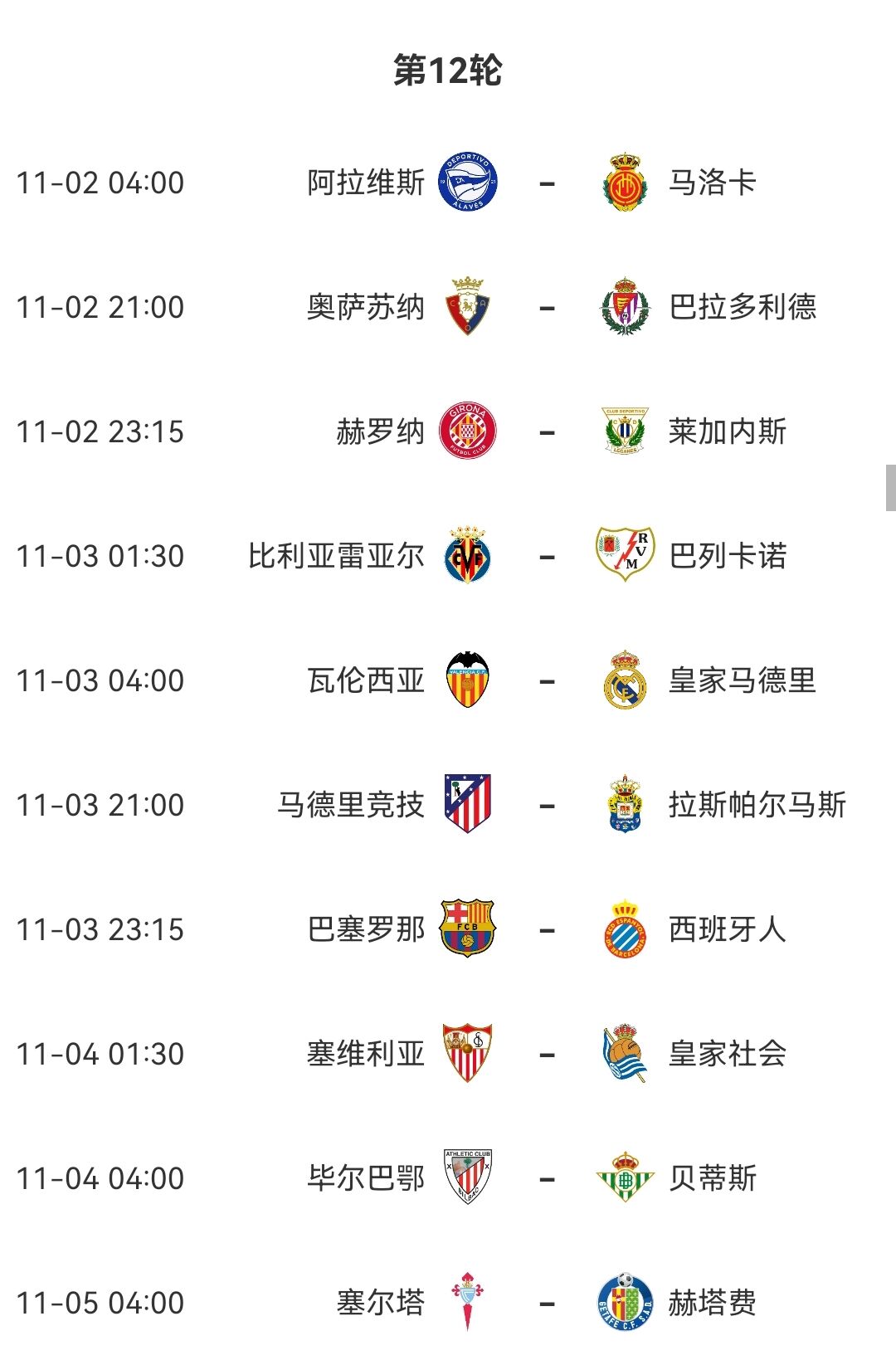 西甲第12轮原赛程↓