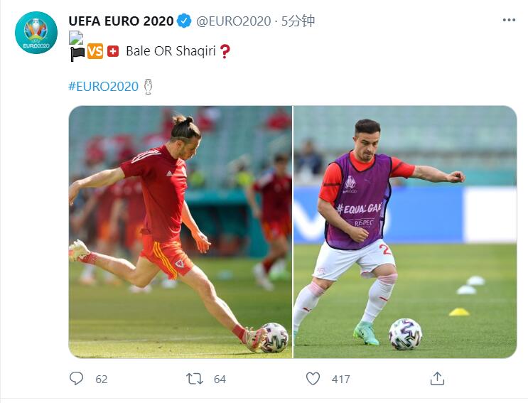 而在赛前,欧足联也贴出了话题——贝尔VS沙奇里,你更看好谁?