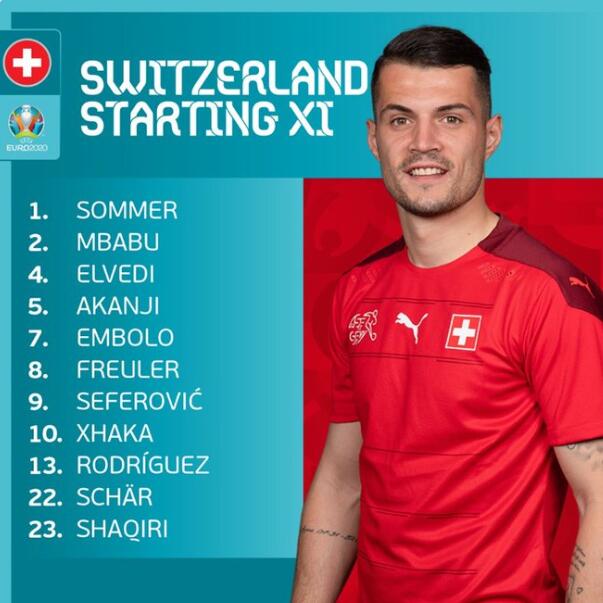 瑞士则派出了:索默、姆巴布、埃尔韦迪、阿坎吉、R·罗德里格斯、舍尔、弗罗伊勒、扎卡、沙奇里、恩博洛、塞费罗维奇。