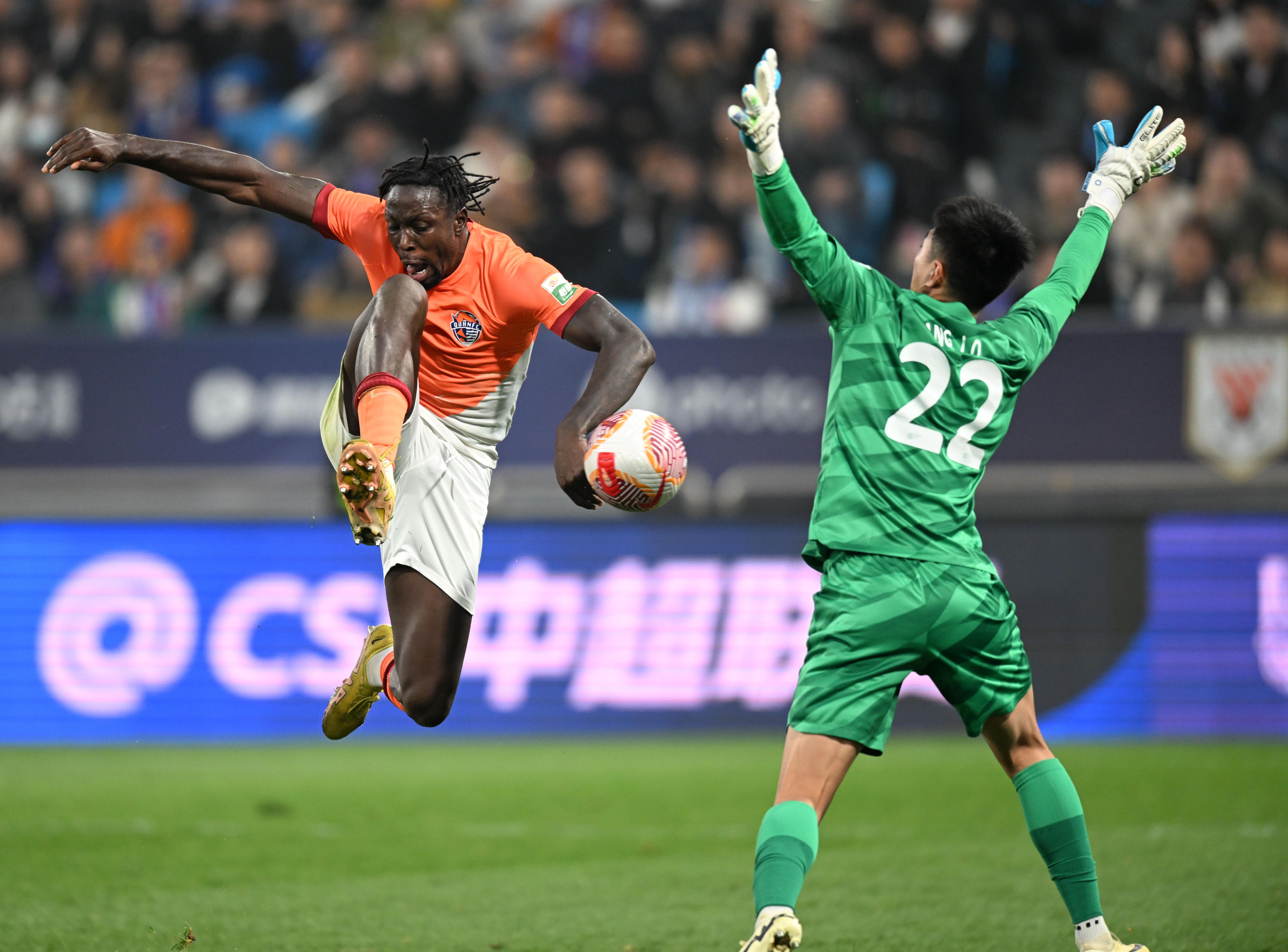 10月27日,青岛海牛队球员博阿基耶(左)在比赛中射门。 新华社记者 赵子硕 摄