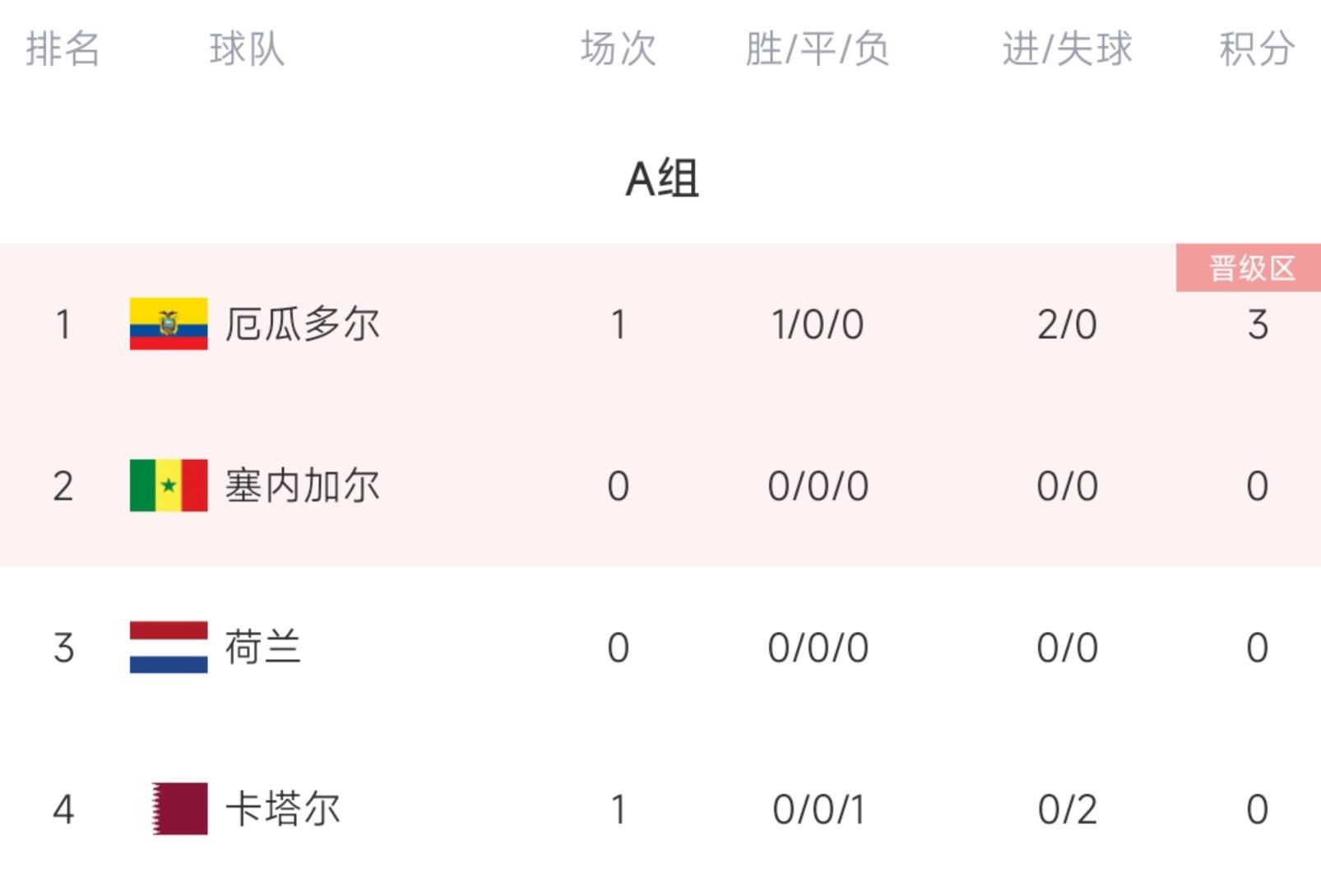 厄瓜多尔暂居头名,东道主卡塔尔垫底。塞内加尔vs荷兰的比赛将在22日0点进行。