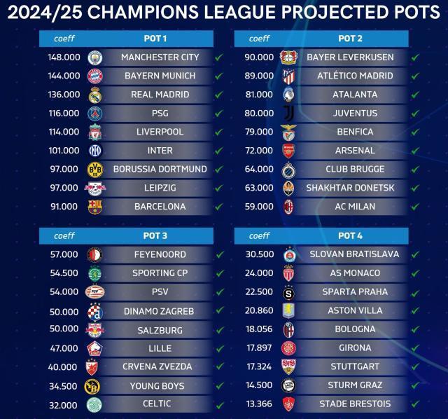 第一档:皇家马德里(卫冕冠军)、曼城、拜仁慕尼黑、巴黎圣日耳曼、利物浦、国际米兰、多特蒙德、莱比锡、巴塞罗那