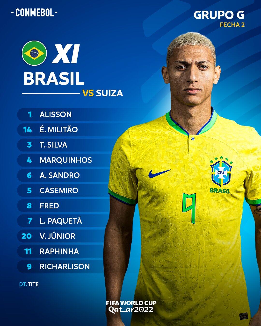 北京时间11月29日凌晨0点,2022卡塔尔世界杯小组赛第二轮,巴西队将对阵瑞士队。赛前,双方公布了首发名单,巴西队的内马尔因伤缺席,里沙利松、维尼修斯和拉菲尼亚组成攻击线,瑞士队的佐默、阿坎吉和恩博洛首发。