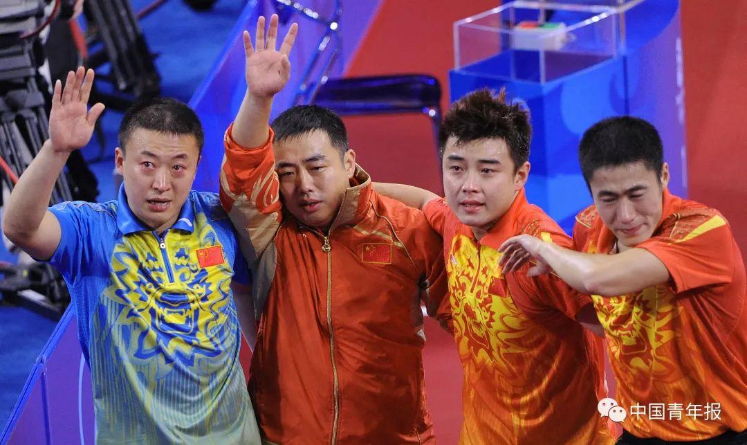 2008年8月18日,刘国梁(左二)、王皓(右二)、王励勤(右一)和马琳满含热泪向观众致意。当日,在奥运会乒乓球男子团体比赛中,由王皓、王励勤和马琳组成的中国队发挥出色,以3比0战胜德国男队,获得金牌。刘占坤/摄