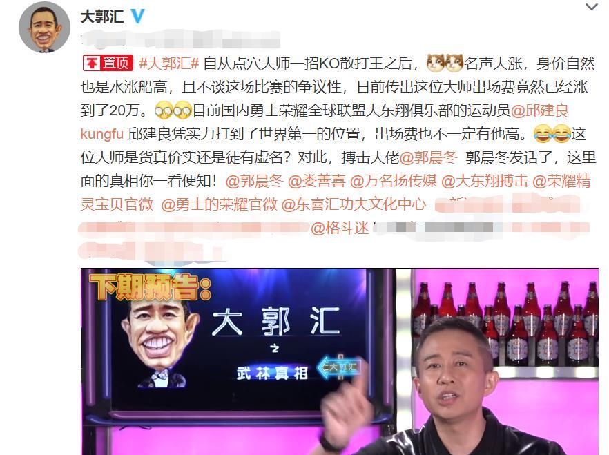 我们不能直接下定论,还是听听国内权威大佬是怎么说的吧!昨天勇士的荣耀创始人郭晨冬在他的脱口秀节目《大郭汇》中谈到"且不谈这场比赛的争议性,日前传出这位大师出场费竟然已经涨到了20万。目前邱建良凭实力打到了世界第一的位置,出场费也不一定有他高"