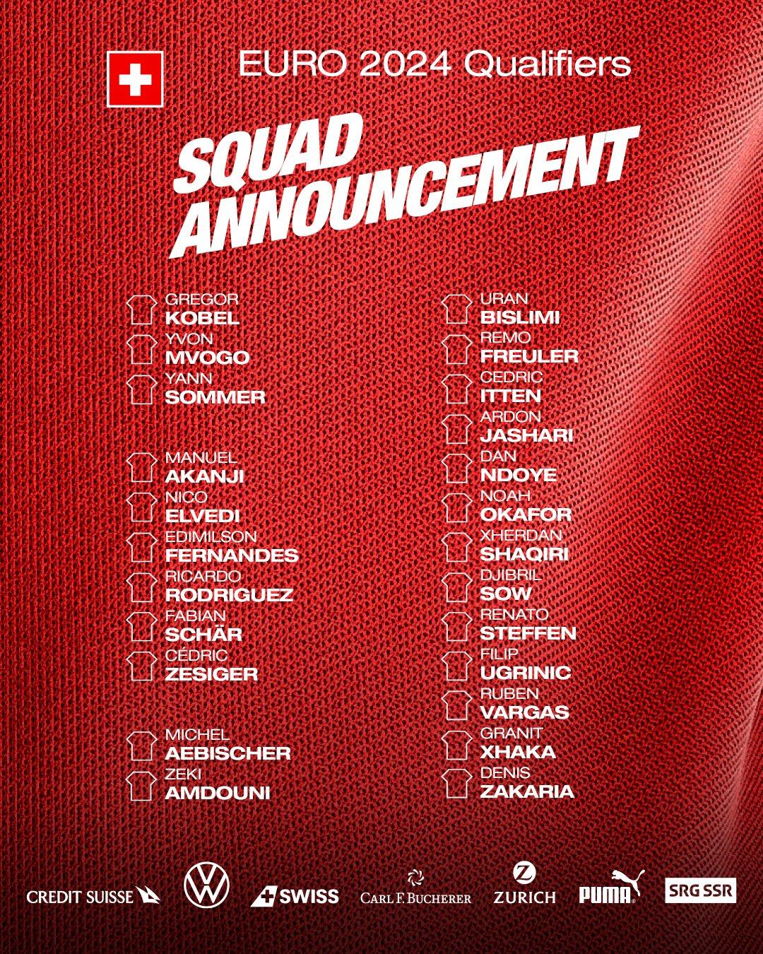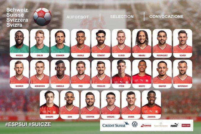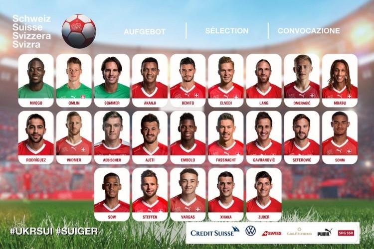 中前场:埃比歇尔(博洛尼亚)、弗雷(巴塞尔)、弗鲁勒(诺丁汉森林)、扎卡(阿森纳)、扎卡里亚(切尔西)、索乌(法兰克福)、恩博洛(摩纳哥)、伊顿(年轻人)、恩多耶(巴塞尔)、塞费洛维奇(加拉塔萨雷)、沙奇里(芝加哥火焰)、斯特芬(沃尔夫斯堡)、瓦尔加斯(奥格斯堡)、奥卡福(萨尔茨堡红牛)