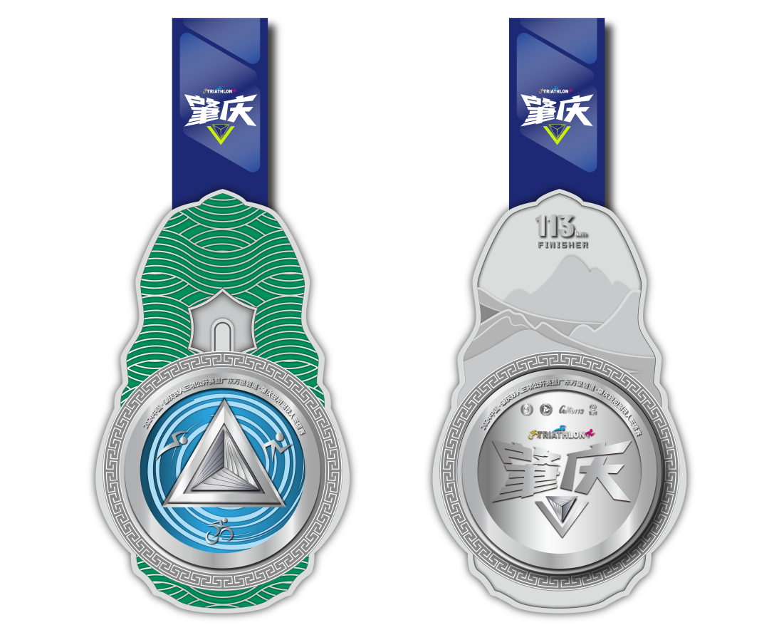 肇 庆铁三完赛纪念奖牌,是荣誉的象征,更是肇庆风情的独特见证。奖牌以肇庆著名风景区砚阳湖为灵感,外轮廓如硕台般古朴大气,承载着这座城市的历史底蕴。 内部的铁人三项立体三角,彰显着运动健儿们的拼搏与坚韧。而肇庆粽子元素的融入,增添了一份地域特色与生活气息。蓝绿色的主色调,仿佛将硕阳湖的澄澈湖水与葱郁植被呈现在眼前,给人以清新自然之感。 这块奖牌,不仅是对完赛者的嘉奖,更是肇庆的一张亮丽名片,让每一位参与者都能铭记在肇庆的这场充满挑战与激情的铁人三项赛之旅。纪念服