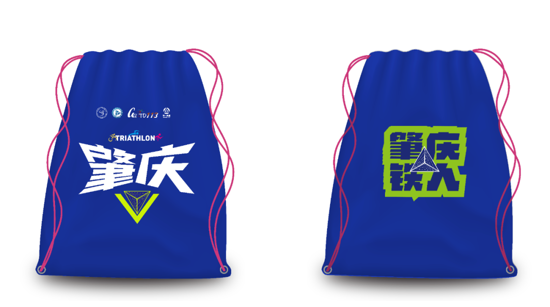 肇 庆铁人三项参赛包,以赛事 VI 色蓝色为主色调,尽显沉稳与活力。正面是精心设计的肇庆铁三 LOGO 字,巧妙融合游泳、骑行、跑步三元素与三角立体组合,排列成倒三角轮廓主形状,既体现了铁三运动的多元魅力,又富有立体感和时尚感。背面 “肇庆铁人” 四个大字时尚有力,与肇庆粽子的铁三角形状组合,增添了地域特色。
