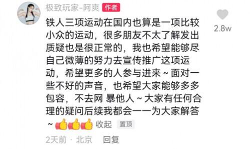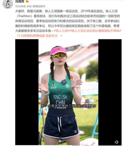 她表示,铁人三项的比赛服有两个版本,一种是带腿的平脚紧身裤,另一种就是阿爽穿的这种不带腿的三角形比赛服。由于大众对这项运动不是特别了解,所以就把三角形的比赛服当成泳衣了。