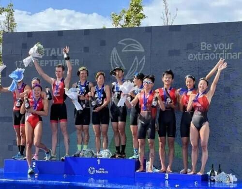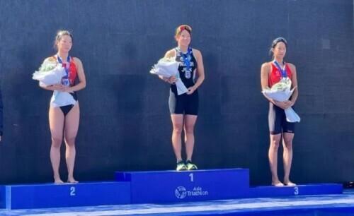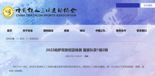 记者在中国铁人三项运动网站上看到,在哈萨克斯坦亚锦赛相关报道中,登上领奖台的中国铁人三项运动员服装就包含两个版本。