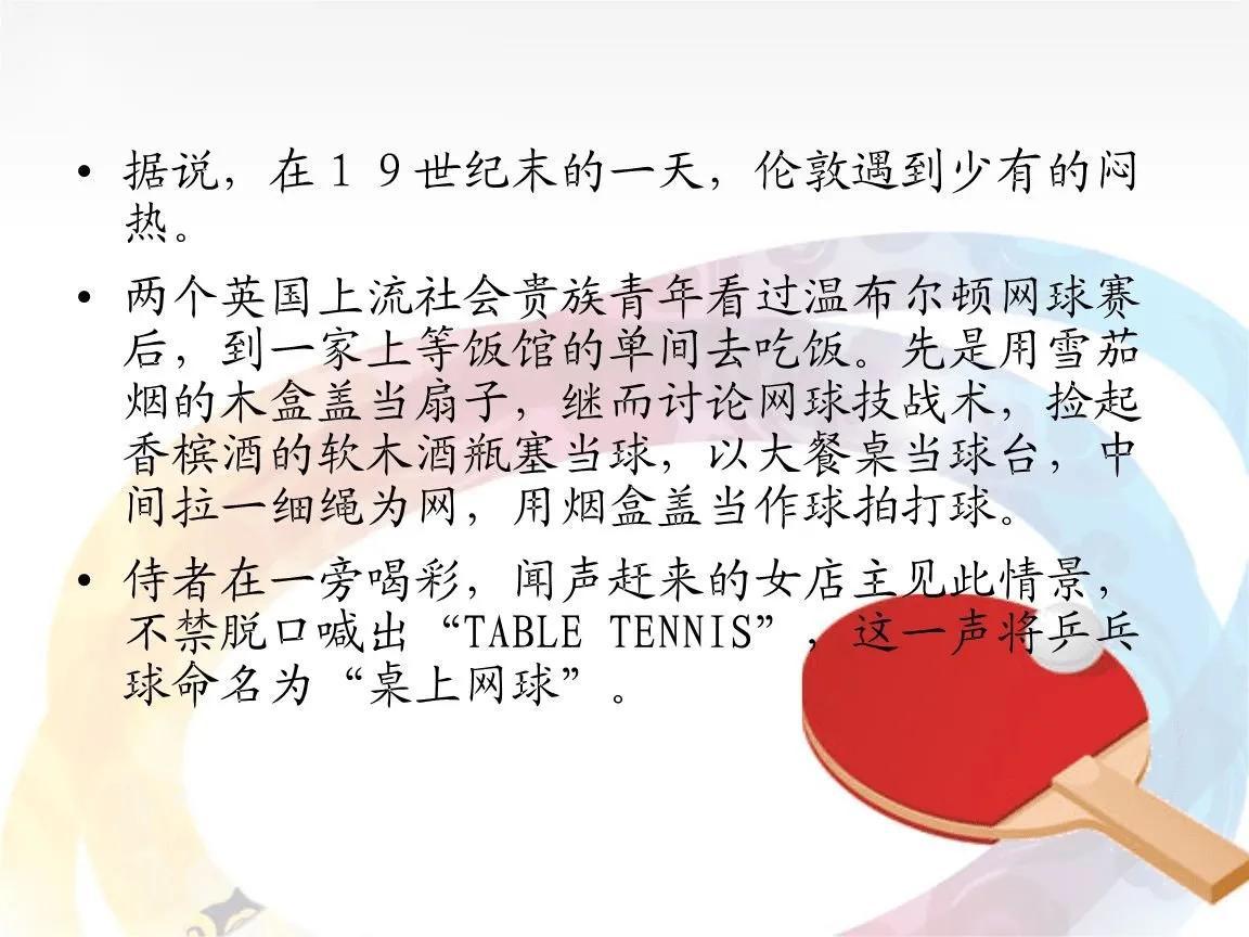 (1)乒乓球起源于英国。19世纪末,欧洲盛行网球运动,但由于受到场地和天气的限制,英国有些大学生便把网球移到室内,以餐桌为球台,书作球网,用羊皮纸做球拍,在餐桌上打来打去。因为在桌上发出“乒乒乓乓”的声音,因此叫做乒乓球或者叫做桌球。