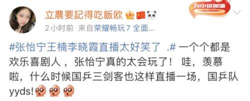 这场干货满满的直播可谓是戳中了网友的笑点,不少人表示,国乒队“个个都是欢乐喜剧人”“太逗了”“把凡尔赛说的那么真诚也是没谁了”。↓
