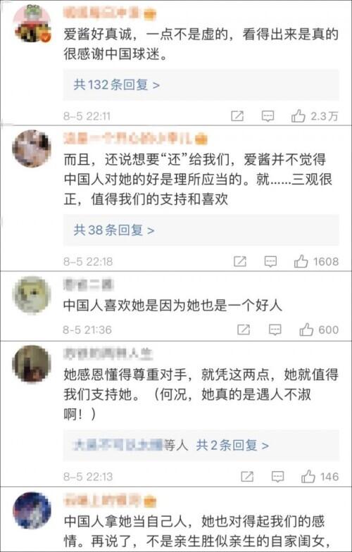 福原爱说:“我刚开始没想到,说实话,真的没想到,中国人、中国朋友们还有球迷们这么支持我。那时我真的很痛苦,中国人真的一直支持我,然后不管是怎么样的我,都接受我。所以,就是我可能说得有点重,但是我可以活到今天,真的是中国人这样支持我,真的很感谢他们。”