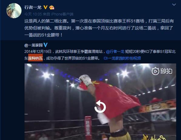 今天,一龙转发了其工作室发布的一场比赛,在武林风渭南站的比赛,一龙 20秒KO了泰拳S1冠军北东莲特纳瓦。 一龙认为一番站打满三回合自己占优势但是被判负,所以潜心备战赢得了二番战的胜利。这次二番战也有网友对于如何KO提出质疑,一龙解释道:"其实主要是第一个重拳头部已经造成重创,只有经历过这种实战历经里的人都懂得。"