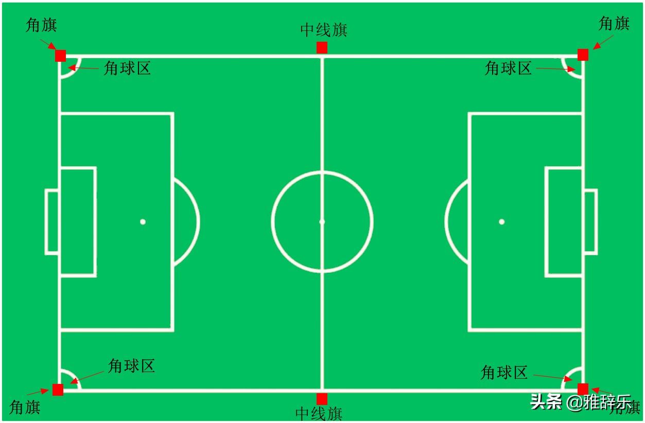 角球弧在球场的四角处,以每个角的边线和球门线的交叉点为圆心,1米为半径画弧,角球弧是四分之一的圆弧。球场四角分别有1个旗杆,旗杆不低于1.5米,平顶,上系一面小旗。在中线的两端,边线外侧不少于1米处,也可以各设置1个旗杆。