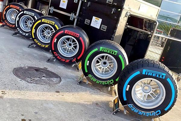 ▲不同配方的F1轮胎(左4为干地胎)