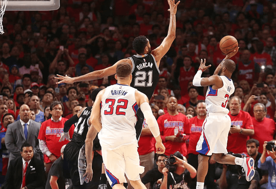 那一年快船还是空接之城,那一年马刺还是卫冕冠军。双方你赢一局我赢一场,把系列赛拖进抢七。全场比赛双方16次战平,31次交替领先。最后时刻是比赛中途遭遇腿部拉伤的克里斯·保罗站了出来,终场前8.8秒,保罗三分线外持球突破在格林和邓肯的夹击之下用一个近乎扭曲的姿势打板命中!彻底杀死了比赛!